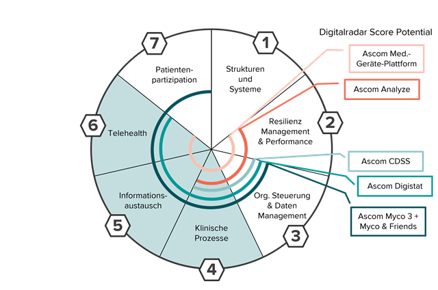 Kommunikationsplattformen sind die Basis für fast alle digitalen Interoperabilitätslösungen. Bspw. bietet die Ascom Medizingeräteplattform die Basis für IT-Lösungen der Dimensionen 2 bis 6. Der Score bzgl. Entscheidungsunterstützungs-systemen wird in den Dimensionen 3 und 4 erfasst.