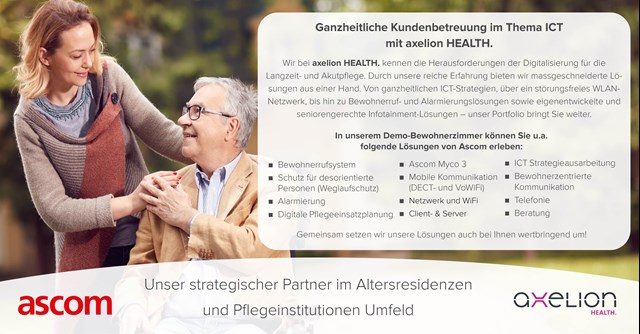 Axelion HEALTH. bietet Ihnen massgeschneiderte Lösungen für alle Herausforderungen im Rahmen der Digitalsierung. Ob ganzheitliche ICT-Strategieausarbeitung, digitale Pflegeeinsatzplanung oder eine bewohnerzentrierte Kommunikation, gemeinsam bringen wir Sie weiter. Mehr Informationen zu axelion HEALTH. finden Sie hier: https://axelion.ch/health/.