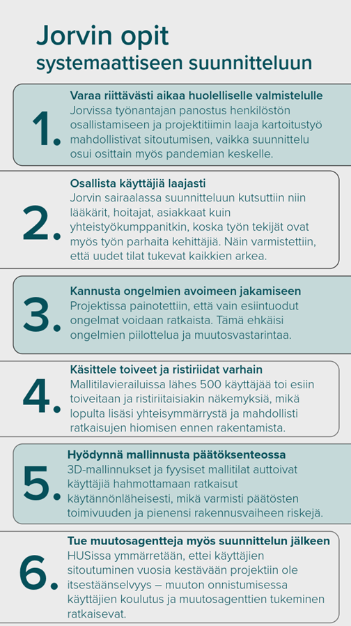 Jorvin uudisrakennushankkeessa myös suunnitteluvaiheeseen on investoitu mittavasti. Työnantajan ja satojen käyttäjien sitoutuminen on pitänyt hankkeen aikataulussa, vaikka matkalle on osunut pandemia, työtaisteluja sekä käyttäjien eriäviäkin toiveita.