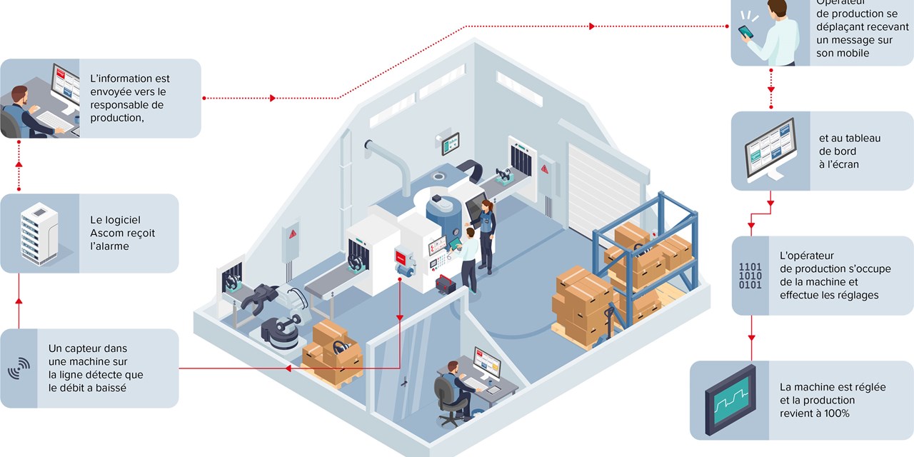 Les solutions Ascom IoT et d'intégration de capteurs vous permettent de collecter et d'envoyer les bonnes informations aux bonnes personnes et au bon moment, ce qui rend la production plus efficace et plus rentable, tout en vous aidant à identifier d'autres gains potentiels.