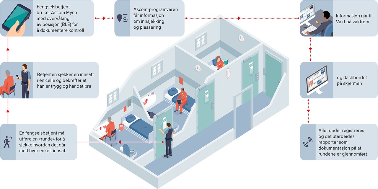 Ascom tilbyr en komplett løsning for sikkerhet for vakter eller fengselsbetjenter, samt sporing av aktivitet for å vise at de nødvendige kontrollene er utført. Løsningen er basert på mobile enheter med innebygde sikkerhetsfunksjoner for ansatte, som panikkknapper for å utløse en alarm, lokaliseringsteknologi i sanntid, alarmdashbord, hendelseskartlegging og arbeidsflyt for mobil respons. For ikke å snakke om muligheten til å sjekke inn på hvert enkelt sted og dokumentere at de nødvendige oppgavene er utført.
